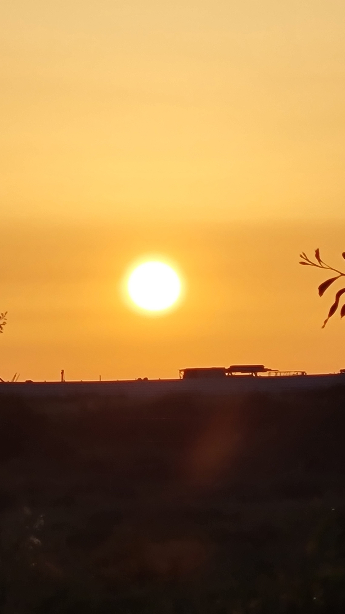 The image shows a bright sun in a hazy, orange sky. The sun appears to be low in the sky, possibly during sunrise or sunset. The horizon is obscured by the haze. There is a dark, vertical object silho…read more