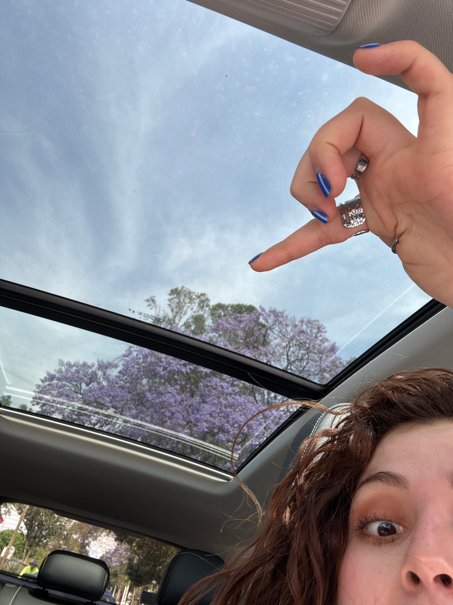 The image shows a partial view of a person inside a car, likely in Mexico City based on the presence of Jacaranda trees in bloom, which are common in the city. The person is looking up towards a sunro…read more