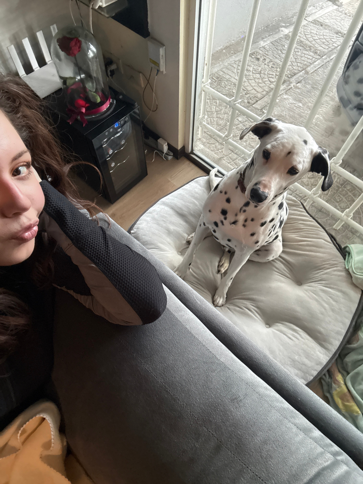 A Dalmatian dog sits on a dog bed next to a gray sofa. A woman is lying on the sofa, taking a selfie. A glass-encased rose sits on a table next to the woman. A window with a white metal gate is visibl…read more