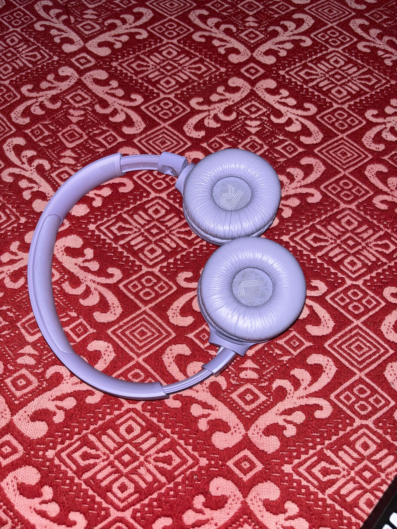 The image shows a pair of purple headphones resting on a red patterned fabric. The headphones are oriented with the earcups facing upwards, positioned in a way that suggests a stylized smiling face. T…read more