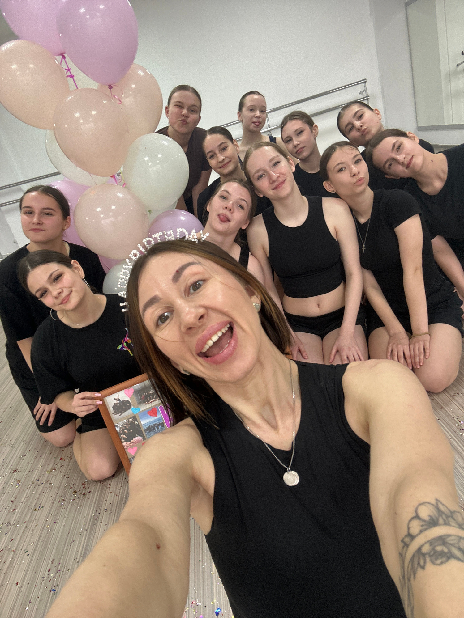 A group of at least thirteen people, mostly young women, are visible in a selfie. They are in an indoor location, possibly in Votkinsk, Russia, though there are no visual indicators to confirm the cit…read more