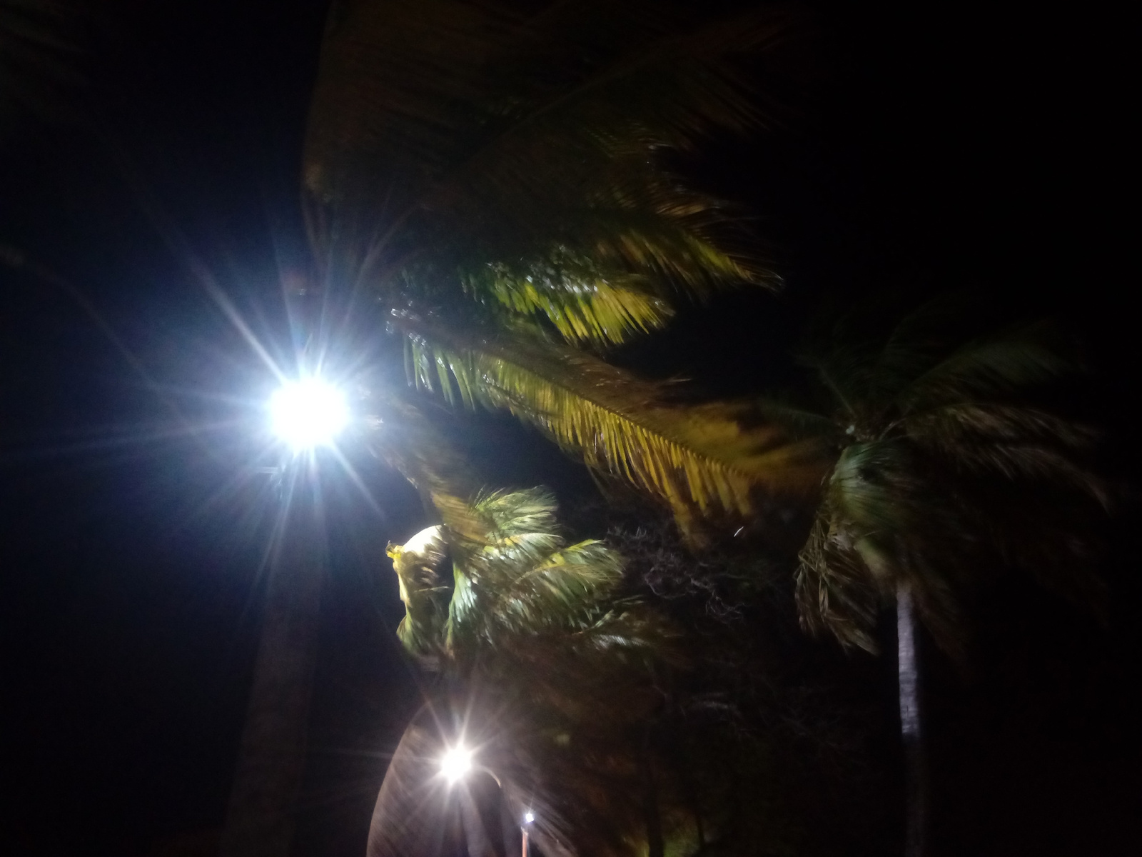 The image depicts a night scene in Juan Griego, Venezuela, featuring palm trees illuminated by streetlights. One particularly bright light source dominates the left side of the image, creating a stron…read more