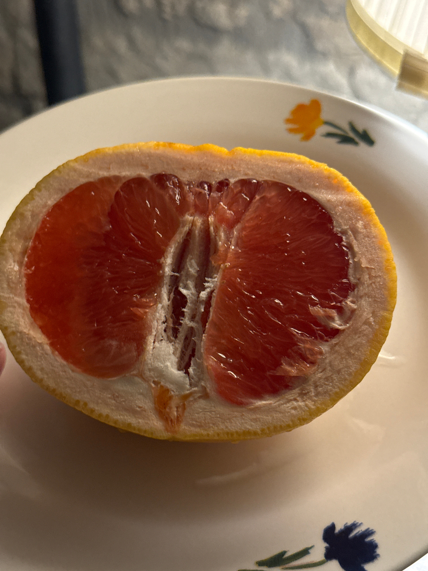 A halved grapefruit sits on a white plate. The plate has a floral pattern in yellow and blue. The fruit is bright red and juicy.