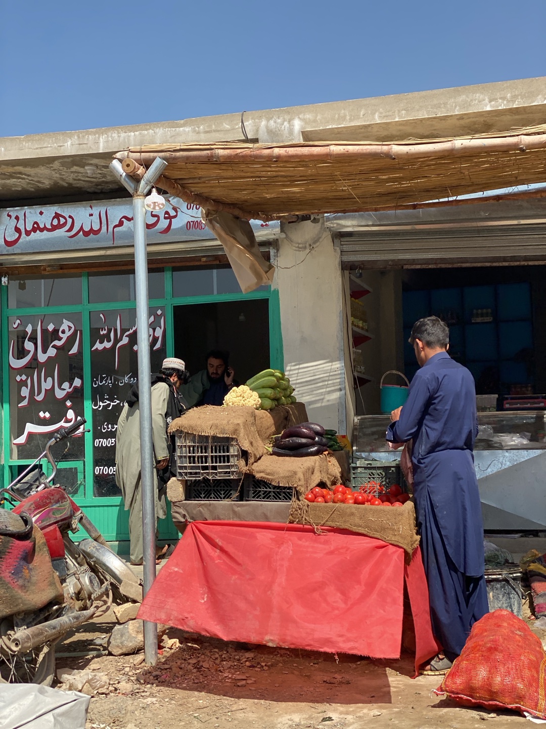 Outside a shop in Kandahar, Afghanistan, a man in a dark blue shalwar kameez stands facing a vendor's stand, possibly purchasing produce. The stand displays tomatoes, eggplants, caulifower, and zucchi…read more