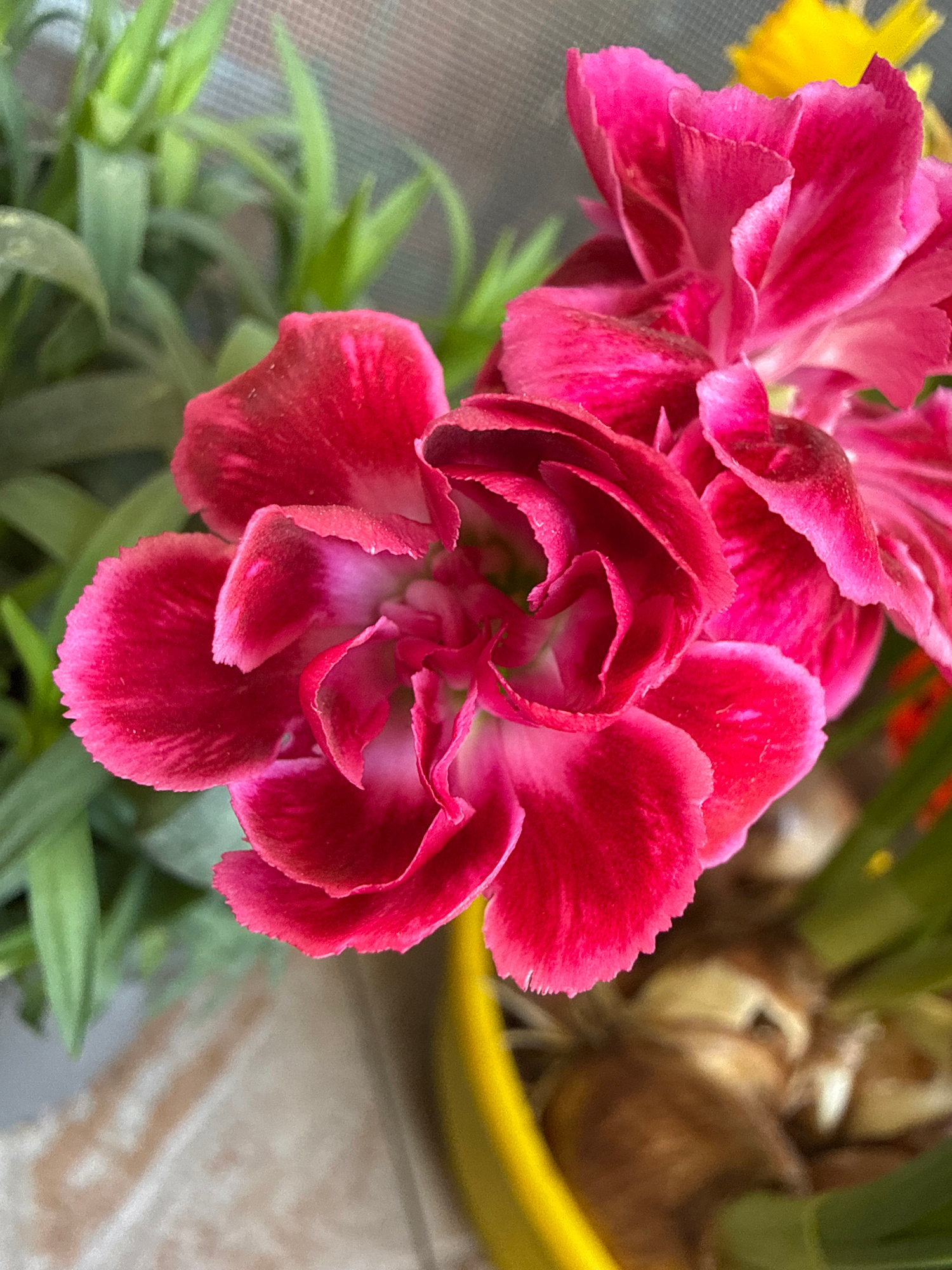 A close-up shot of two pink carnation flowers in a pot. The flowers are the primary focus, with intricate petal arrangements and a rich pink hue. Green foliage and bulbs are visible in the background,…read more