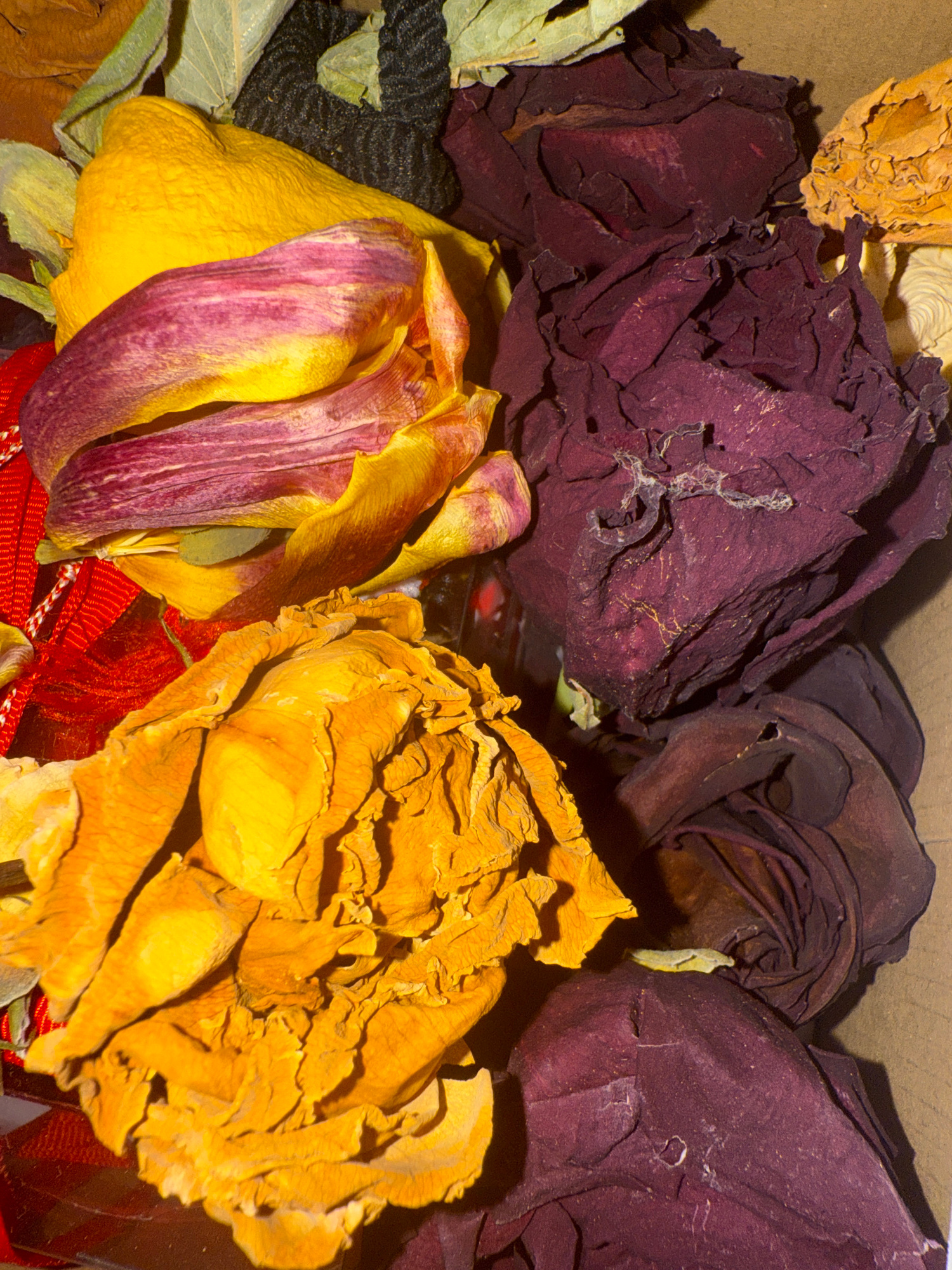 The image displays a close-up, overhead view of a collection of dried flowers and plant material, likely contained within a cardboard box. The primary subjects are several withered flowers, predominan…read more
