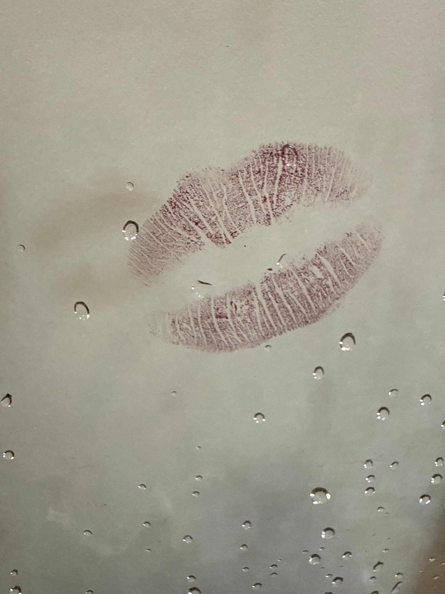 The image shows a lipstick print on a glossy surface, likely glass or a similar material, with water droplets scattered across it. The lipstick print is in a shade of deep red and exhibits a detailed…read more