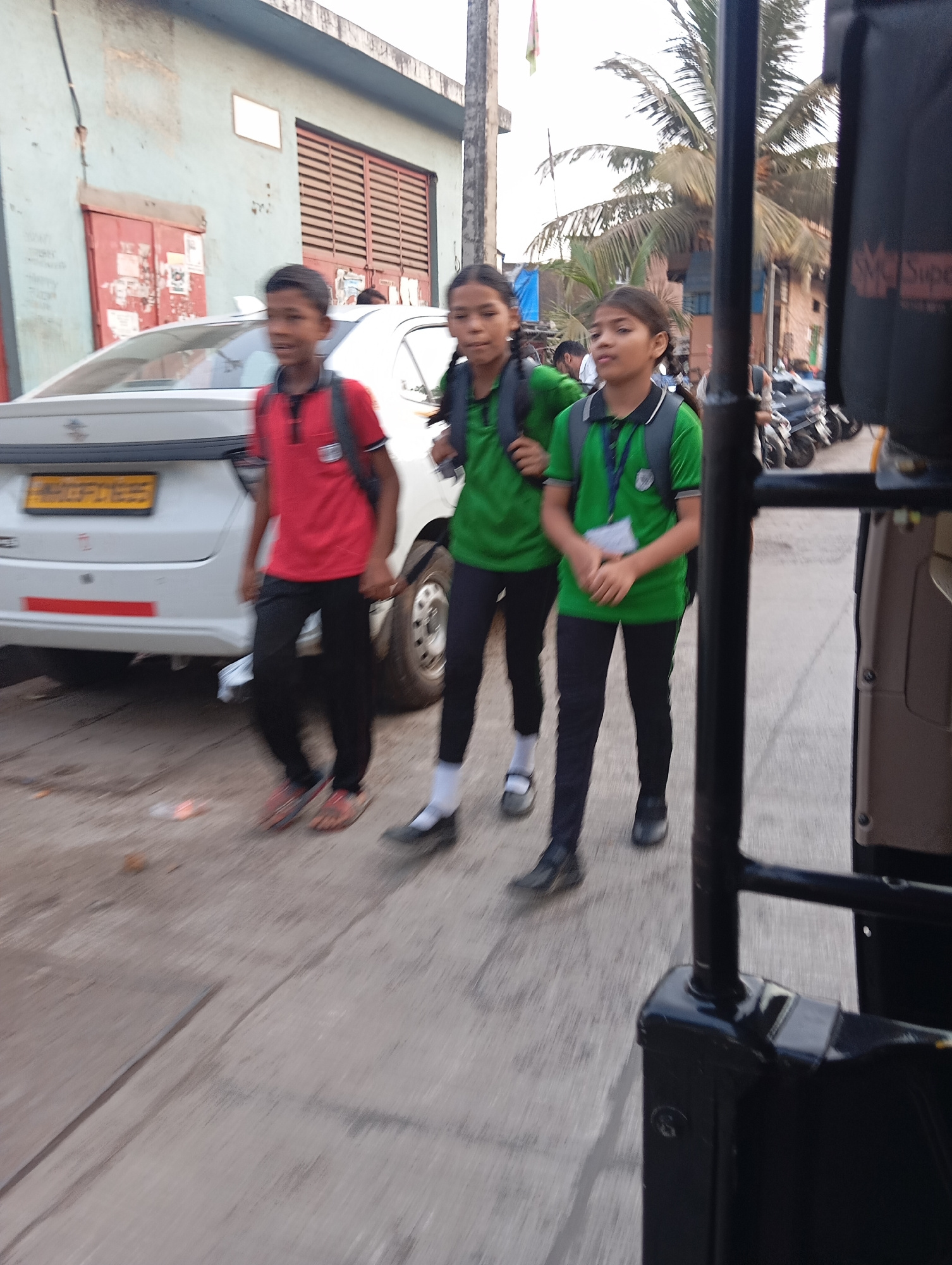 Three school children, one boy and two girls, walk together on a street adjacent to a white car. The boy wears a red shirt and black pants with a black backpack, while the girls are dressed in green s…read more