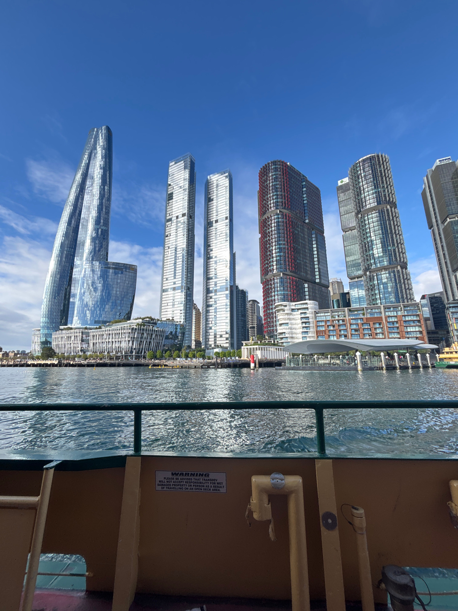 The image, taken from a boat or ferry, shows the skyline of Barangaroo, Australia. Several modern skyscrapers of varying designs and heights are visible against a blue sky with some clouds. Water fill…read more