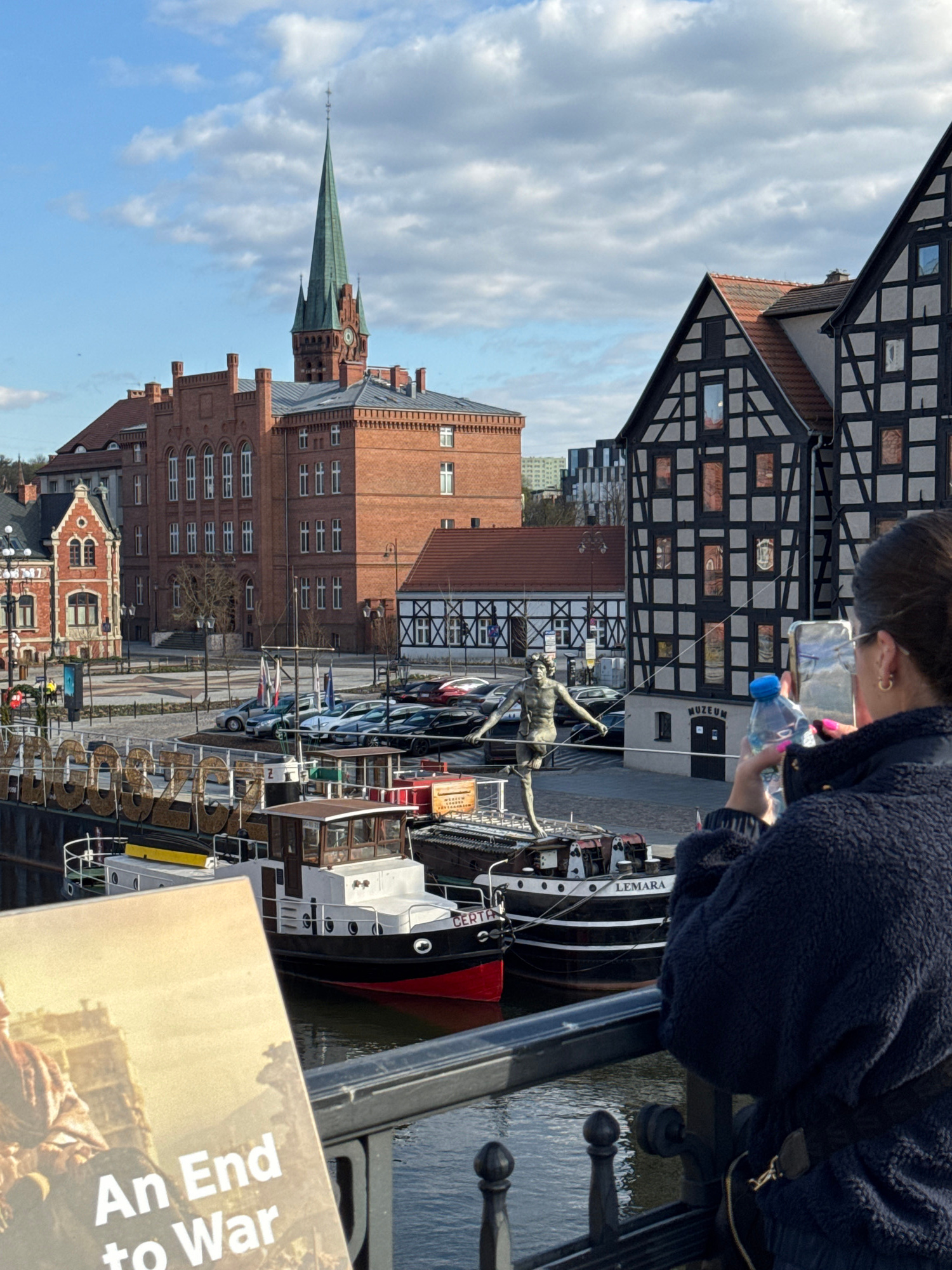 A medium eye-level shot captures a scene in Bydgoszcz, Poland. A person, primarily visible from the shoulders up, holds a water bottle and appears to be using a smartphone. They are positioned at the…read more