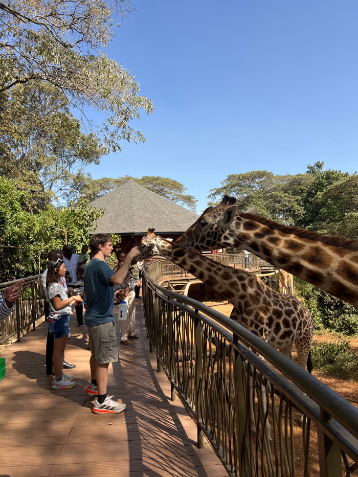The image depicts a daytime outdoor scene at the Giraffe Centre in Nairobi, Kenya, where individuals are interacting with Rothschild's giraffes on an elevated wooden platform. A young Caucasian male,…read more