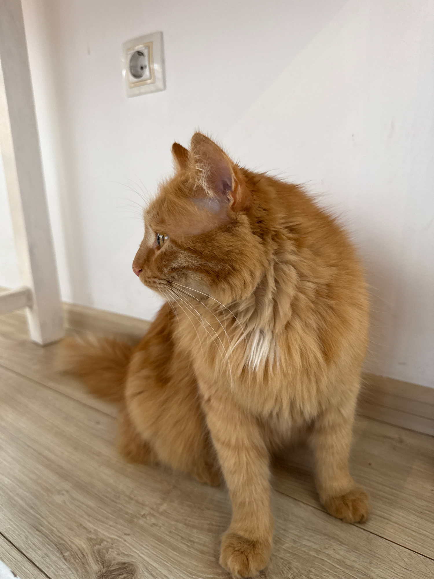 A ginger cat is sitting on a light-colored wooden floor, near a white wall with an electrical outlet. The location is likely inside a building in Berkovitsa, Bulgaria. The cat is looking down and to t…read more