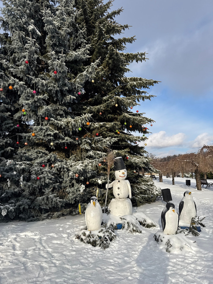 The image captures a snowy winter scene within the National Botanical Garden named after M.M. Hryshko in Kyiv, Ukraine. A large evergreen tree, dusted with frost or snow, dominates the left side, deco…read more