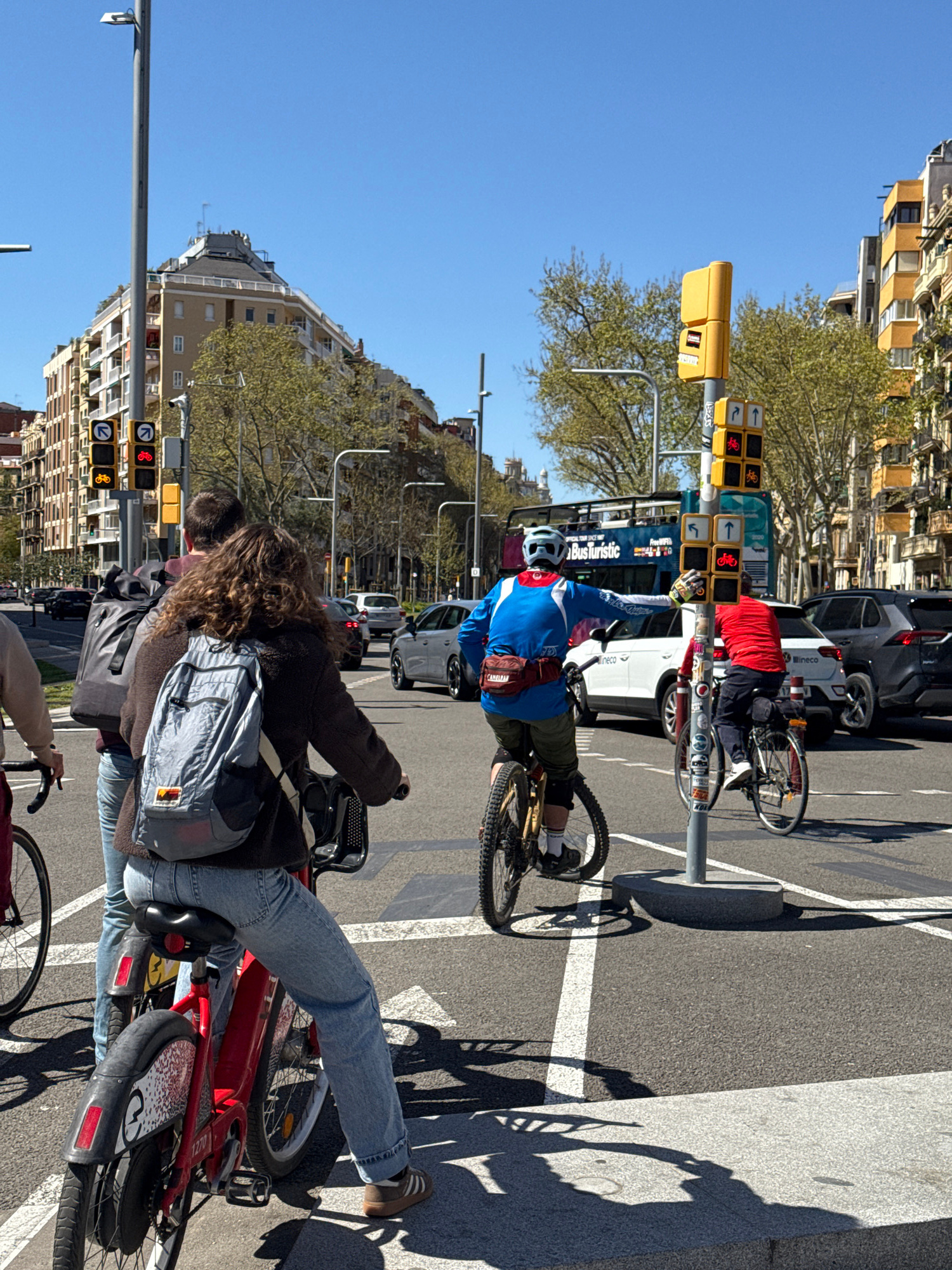 The image captures a street scene in Barcelona, Spain, featuring cyclists and pedestrians at a traffic intersection. The location is suggested by the architectural style of the surrounding buildings,âĻread more