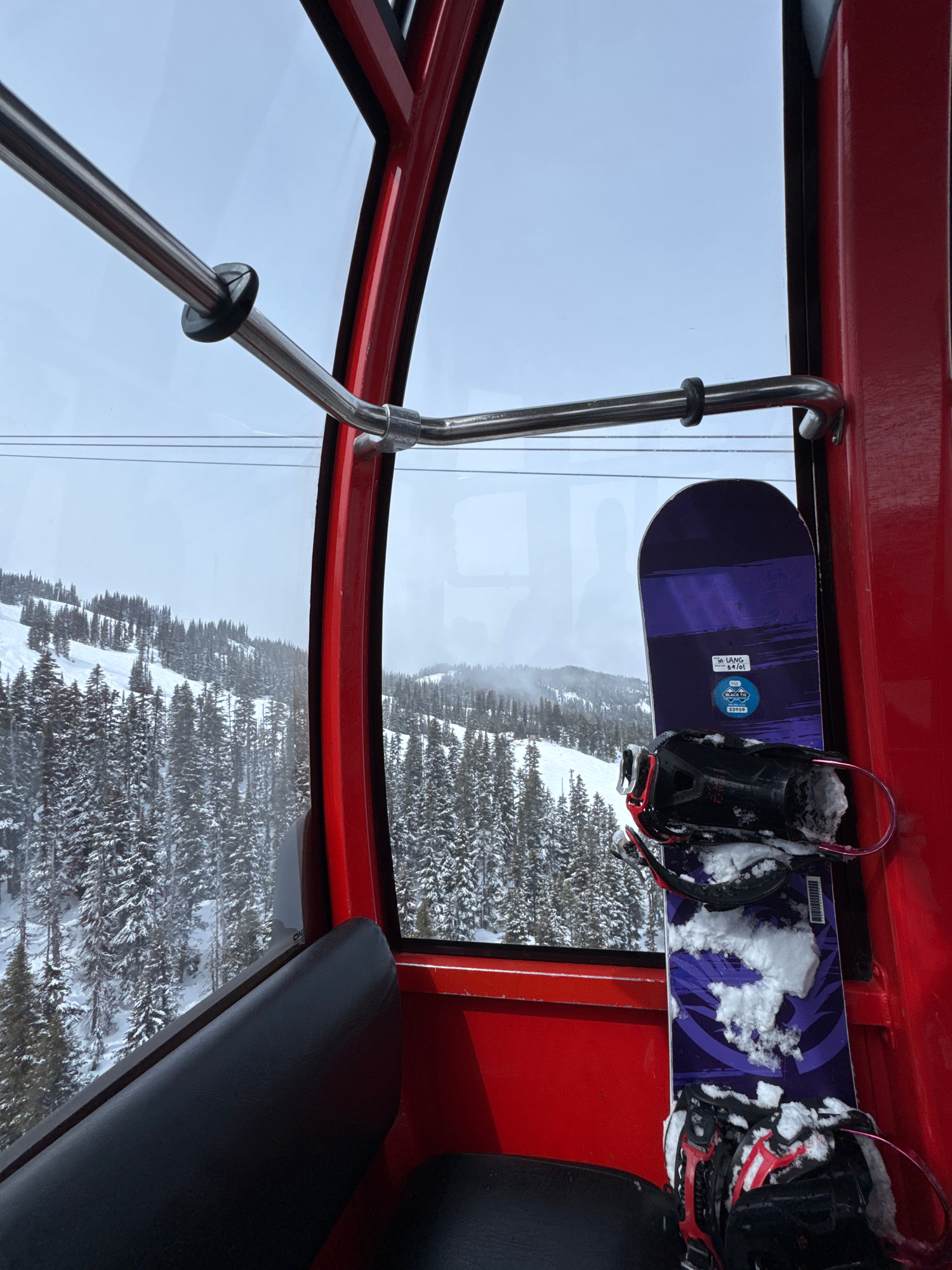 A purple snowboard with black bindings, speckled with snow, hangs from a red-framed gondola. Outside the window, a dense forest covered in snow is visible under a cloudy sky. The view suggests the gon…read more