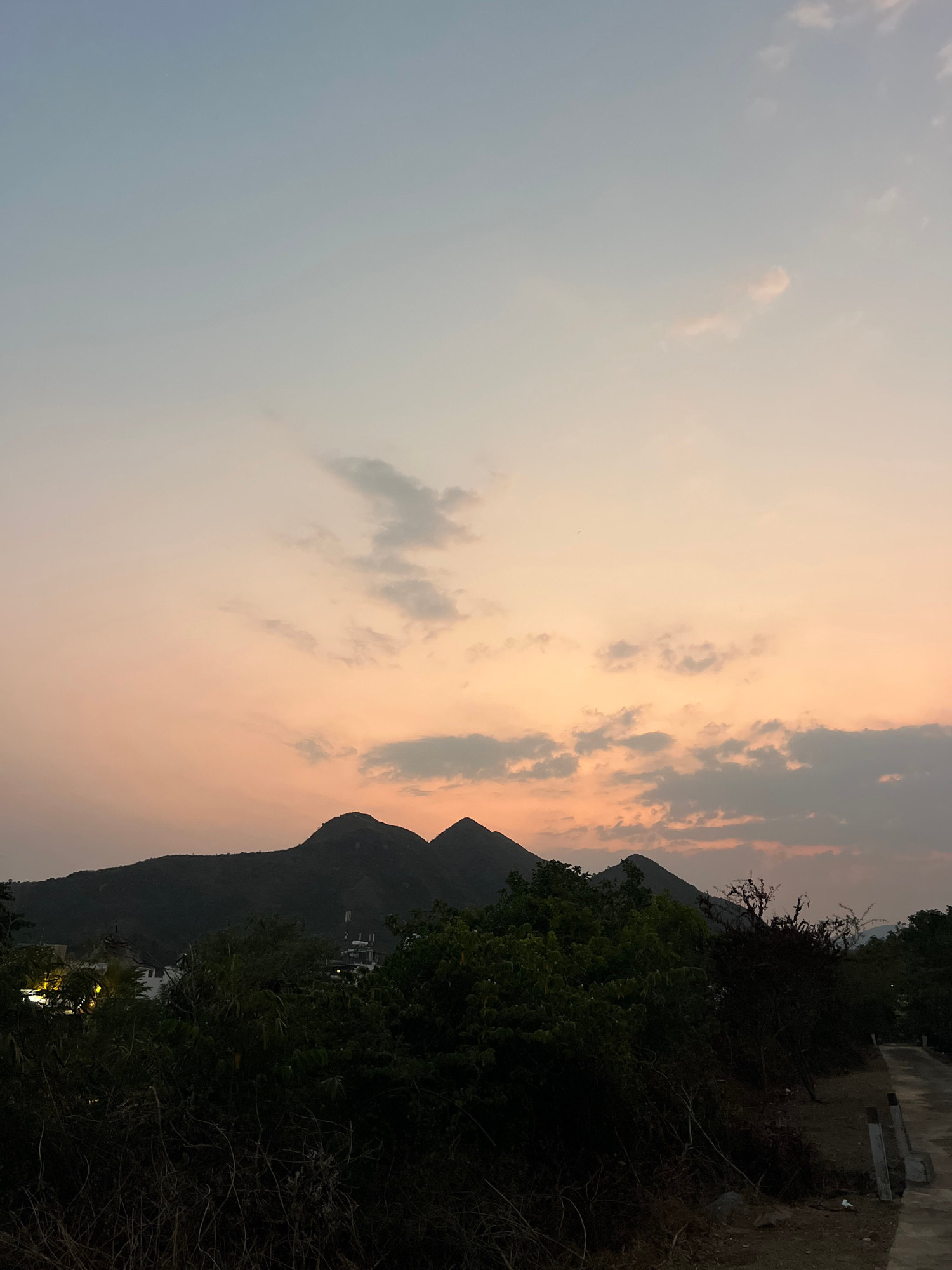 The image depicts a scene at dusk or dawn in Bắc Nha Trang, Vietnam. A tall, dark mountain dominates the right side of the frame, partially obscured by dense foliage in the foreground. The sky transit…read more