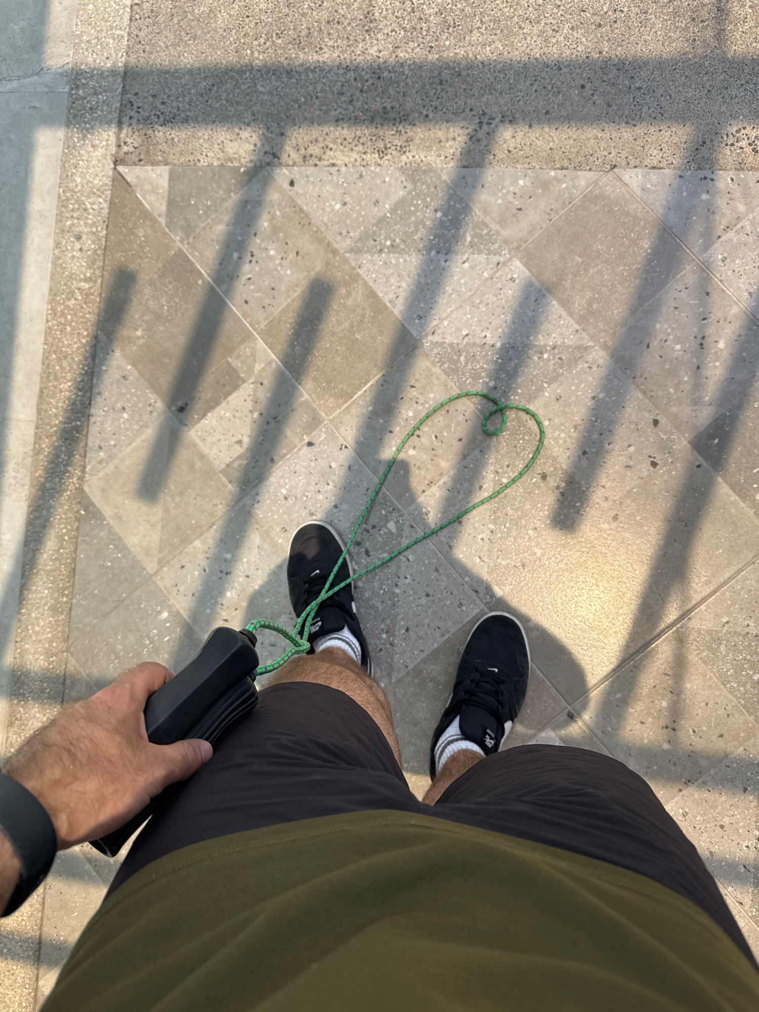 A top-down shot shows a person standing on a tiled floor with sunlight casting shadows. The person is wearing black athletic shoes with white socks, dark athletic shorts, and an olive-green shirt. The…read more