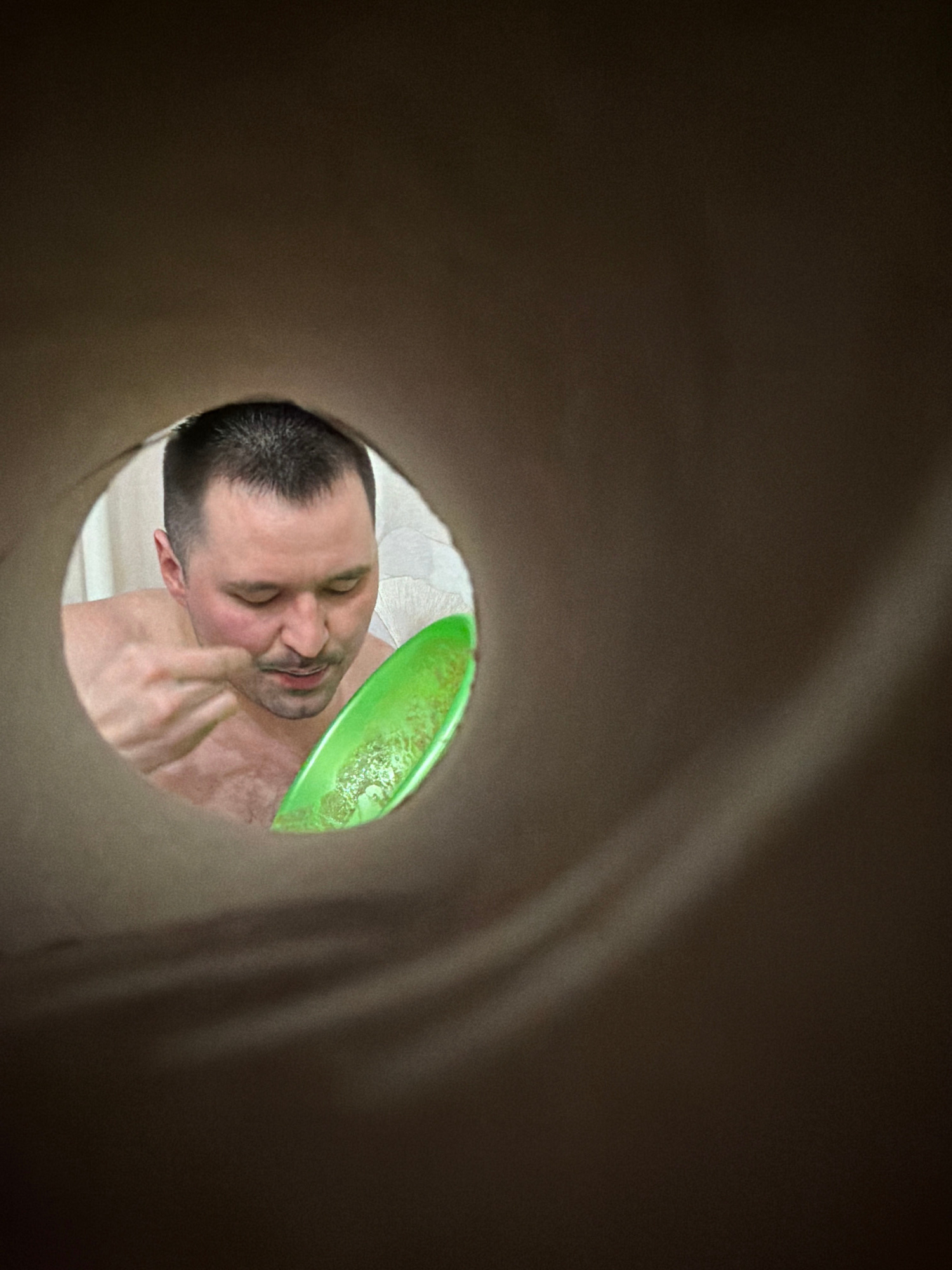 A man is seen through a circular opening inside a brown tube. The man has short dark hair, closed eyes, and is shirtless. He is holding a green plate or disc near his face. The background seen through…read more