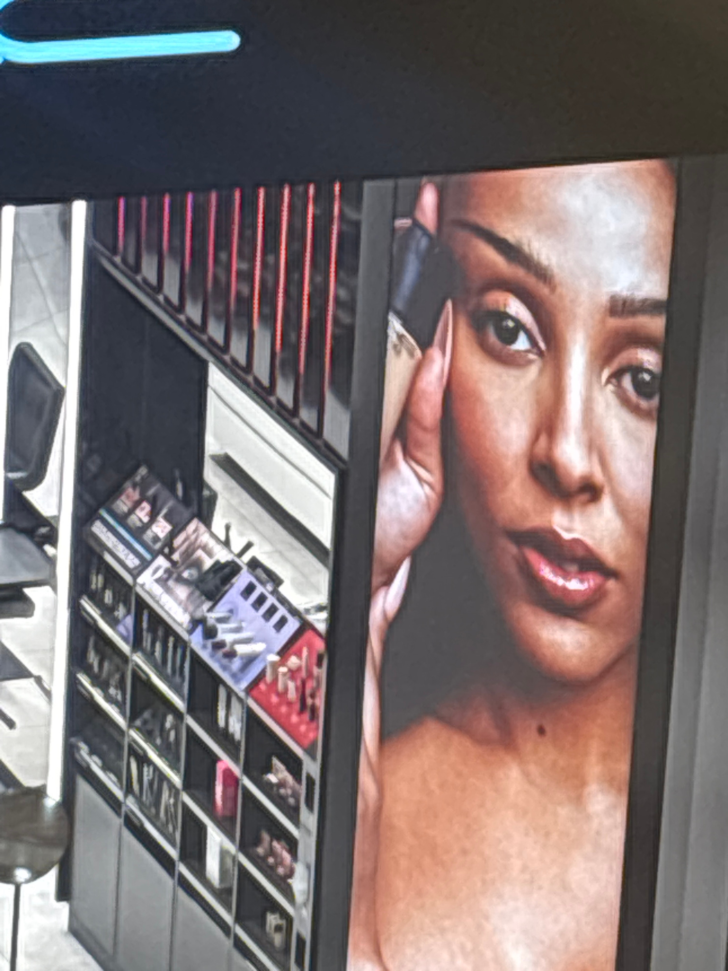 The image shows a makeup display in what appears to be a retail setting. Above the display is a large advertisement featuring a woman with brown skin lying on her side, holding a makeup bottle, likelyβ¦read more