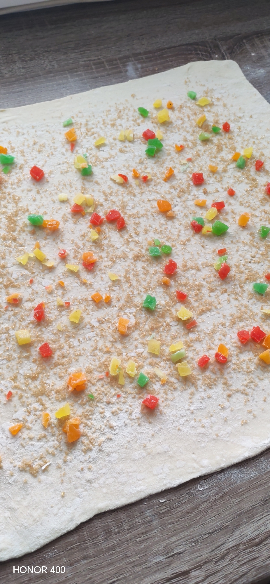 A rectangular slab of dough is spread out on a brown wooden surface. Scattered across the surface of the dough are small, colorful diced fruits (red, green, yellow, orange) and coarse brown sugar. A c…read more