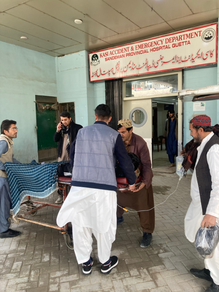 The scene depicts an active medical emergency transport at the entrance of the Kasi Accident & Emergency Department of Sandeman Provincial Hospital, located in Quetta City Tehsil, Pakistan. Seven adu…read more