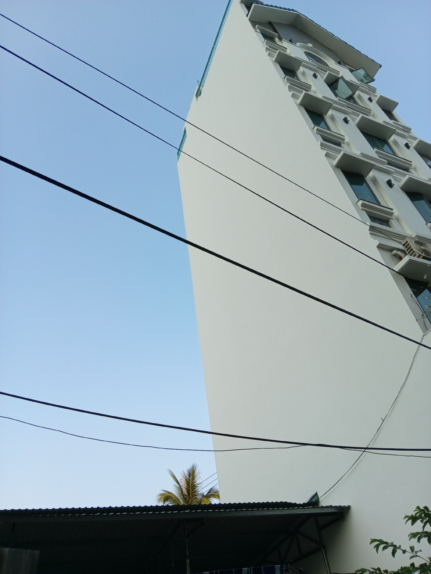 A low-angle shot reveals a tall, white building under a clear blue sky in Bắc Nha Trang, Vietnam. The building, extending upwards and slightly to the right, features rows of rectangular windows with d…read more