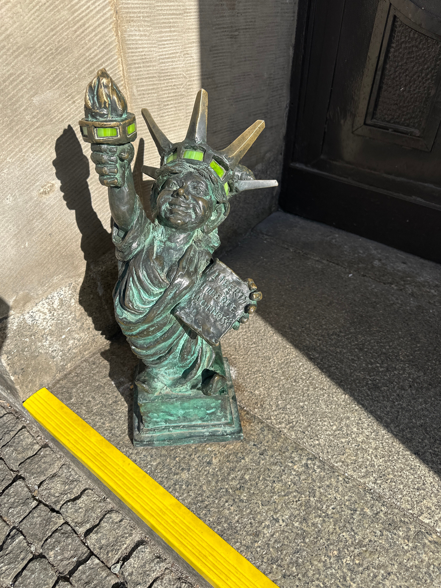 A metal statue of a dwarf dressed as the Statue of Liberty sits at the edge of a stone staircase near a black door. The dwarf wears a crown with green inserts, holds a tablet in his left hand, and rai…read more
