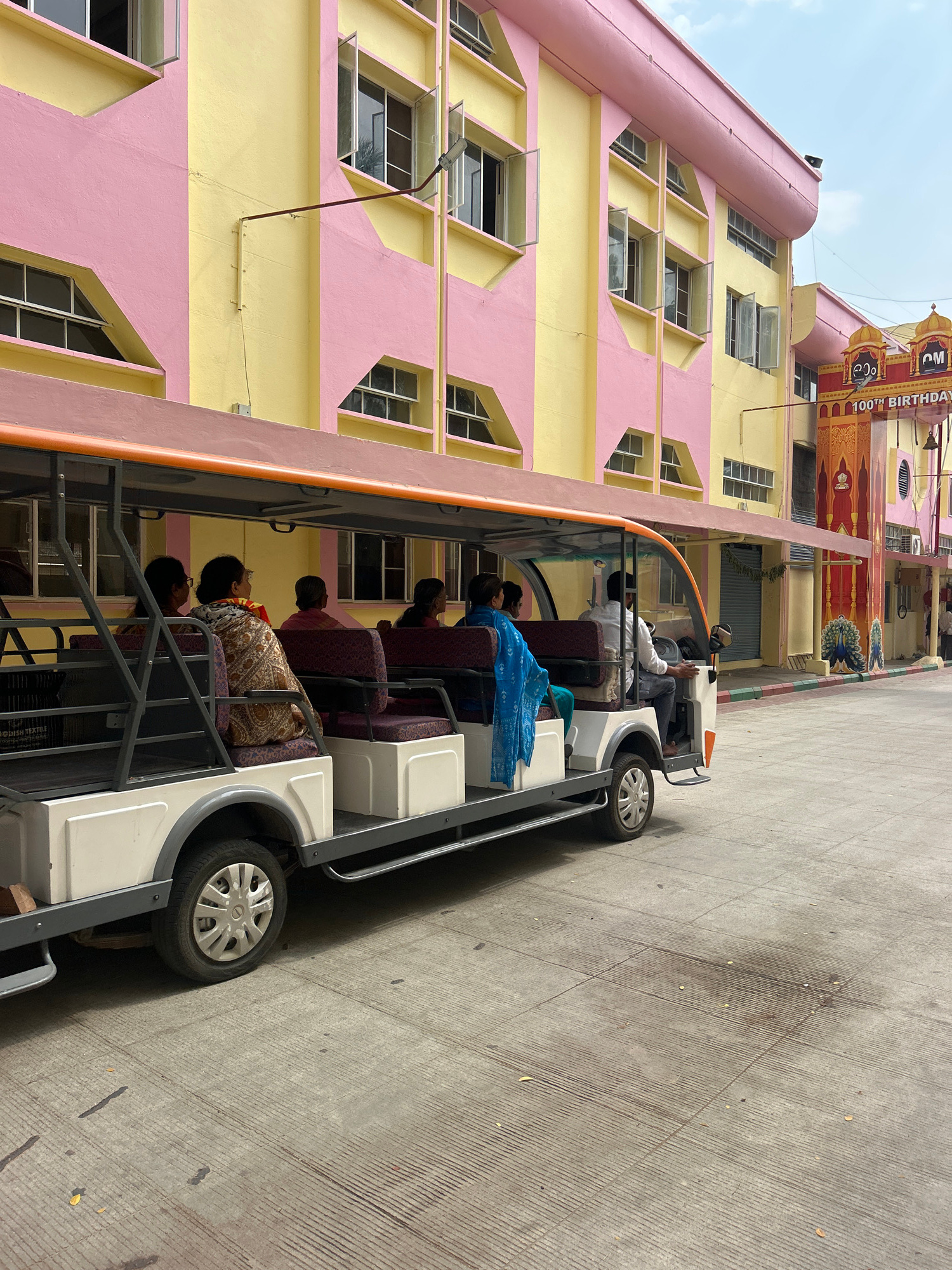 The image shows a small, white, open-sided shuttle carrying passengers in Puttaparthi, India. The shuttle is on a paved road adjacent to a large building with a distinctive pink and yellow facade. The…read more