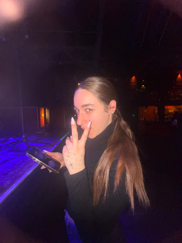 A young individual, likely female, is captured in a nighttime setting, appearing to pose for a photograph. She has long, dark brown hair styled back, and her right eye is clearly visible, looking dire…read more