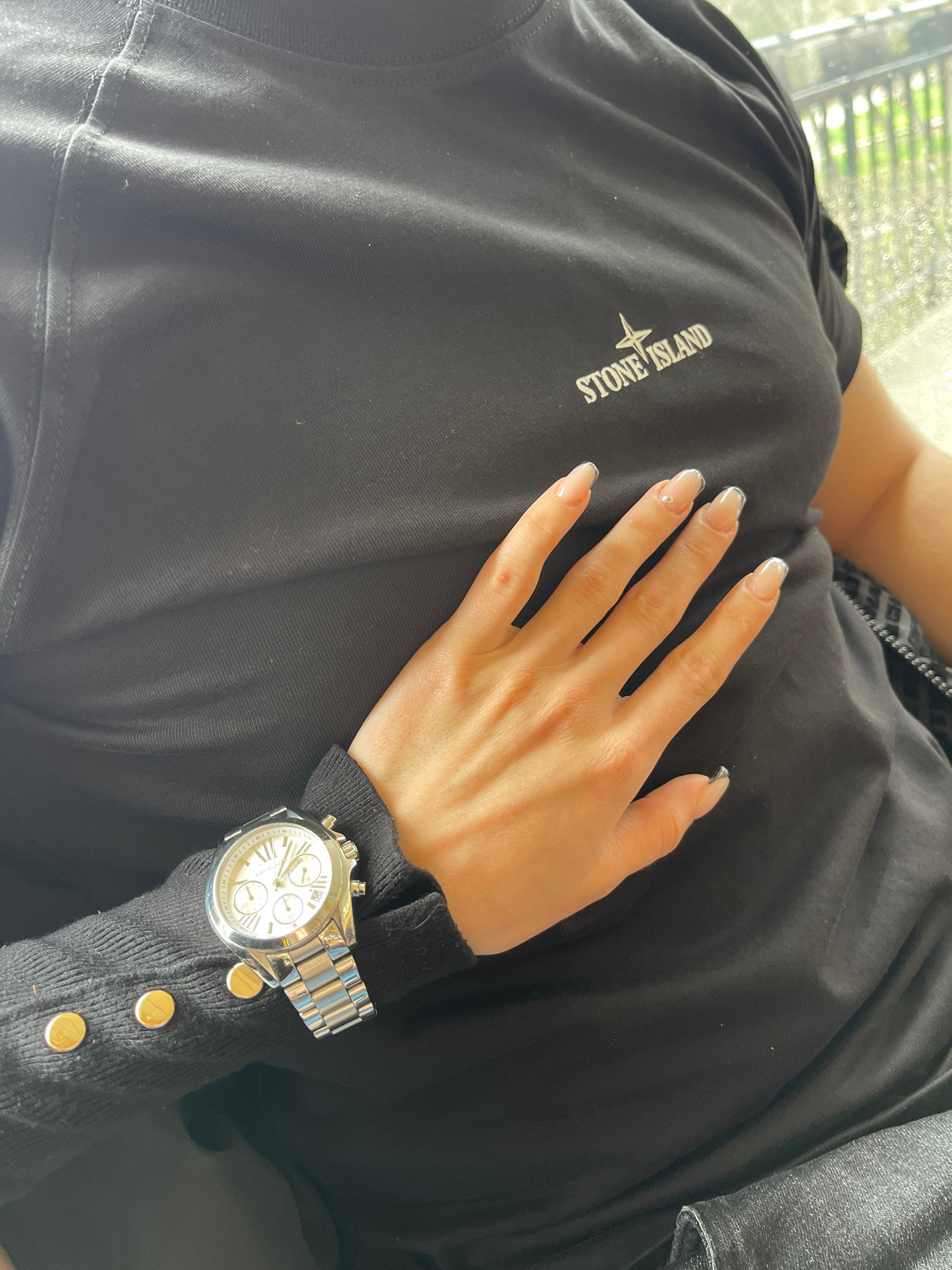 A close-up shot reveals a person reclining, clad in a black Stone Island shirt. The individual's right hand rests on the shirt, adorned with neatly manicured nails. A silver wristwatch with a metal ba…read more