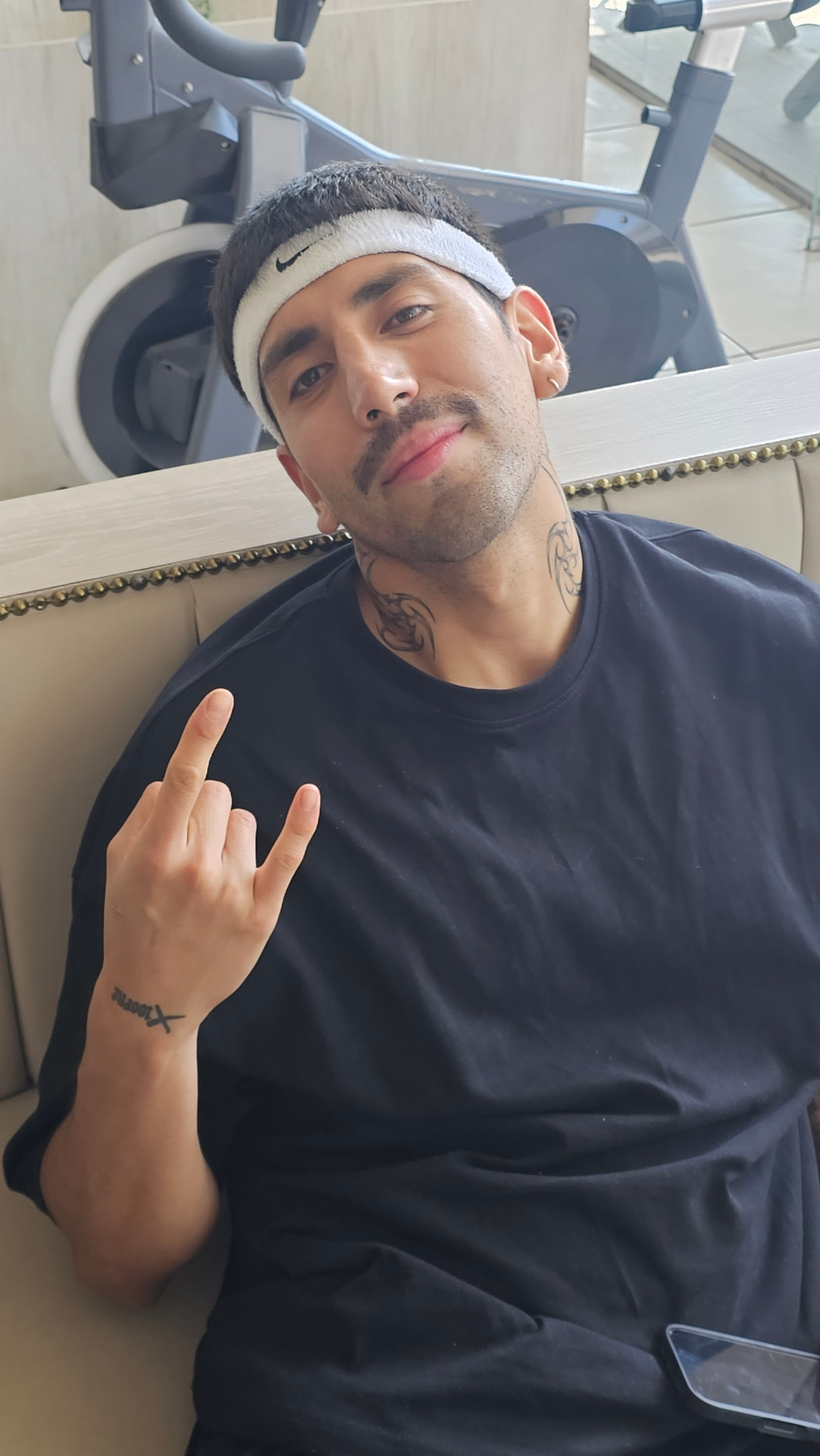 A young man is captured in a close-up, portrait-style shot indoors, likely in a home or gym in Puebla, Mexico. He lies against a light-colored piece of furniture, possibly a sofa or chair with ornate…read more