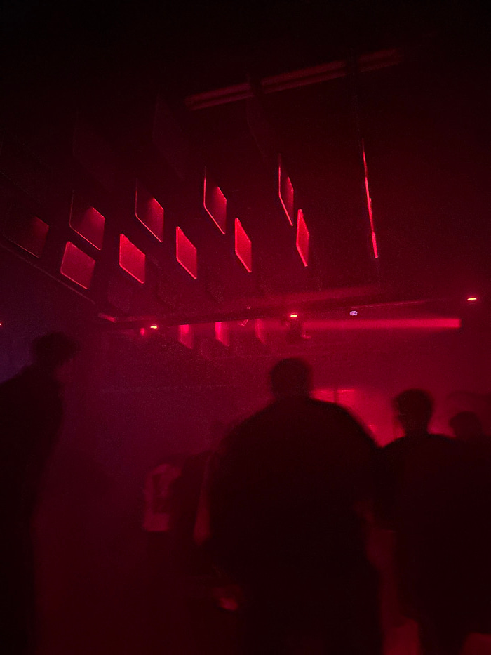 A dark image saturated with red light reveals a computer case interior. Rows of illuminated rectangular components line the side, reflecting on the glass. A vertical strip with red LEDs runs alongside…read more