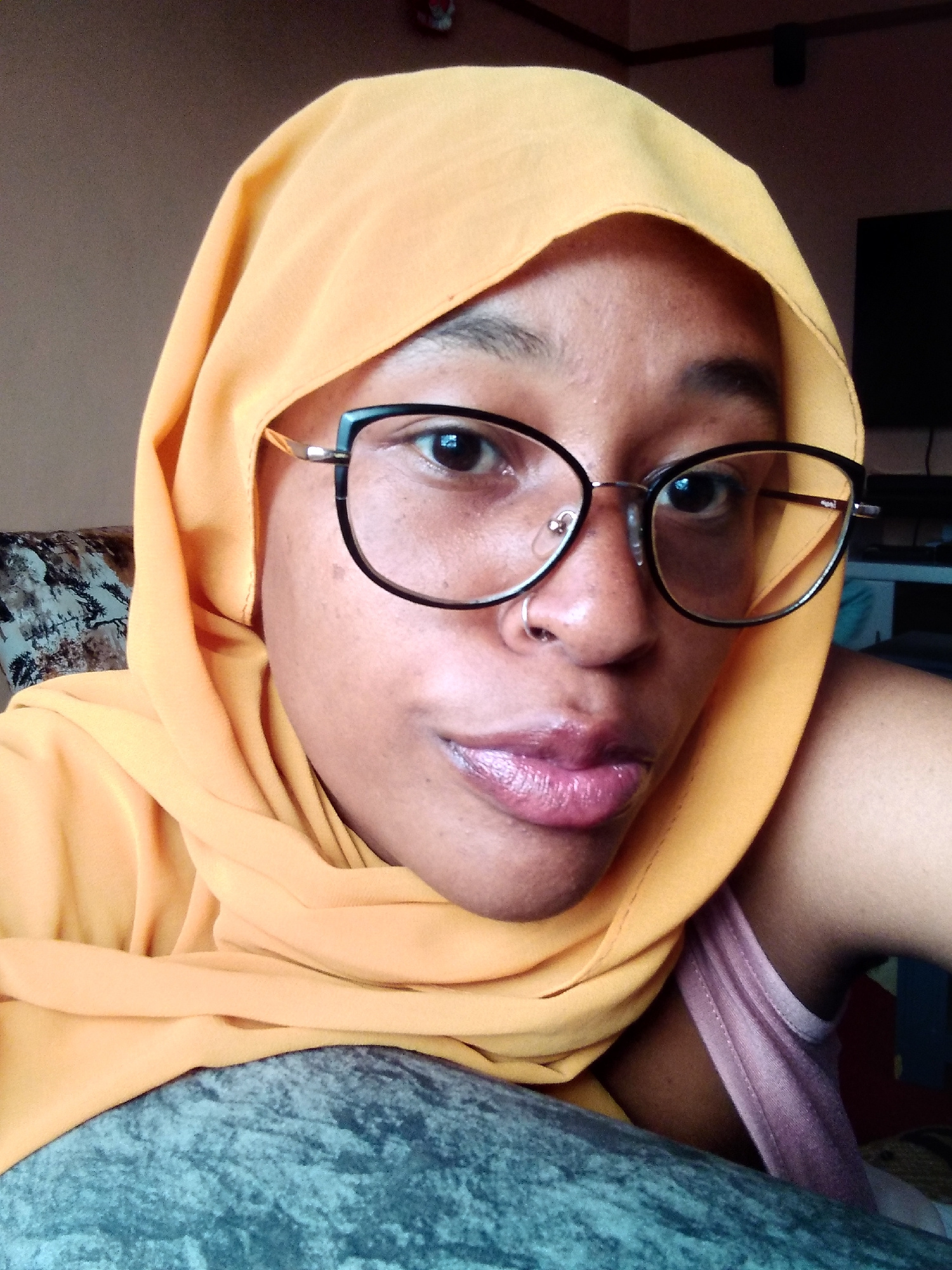 A close-up, angled selfie shows a person with dark skin and black, round glasses wearing a mustard yellow headscarf. They have a silver nose ring and glossy lips. A grey, textured object is visible in…read more