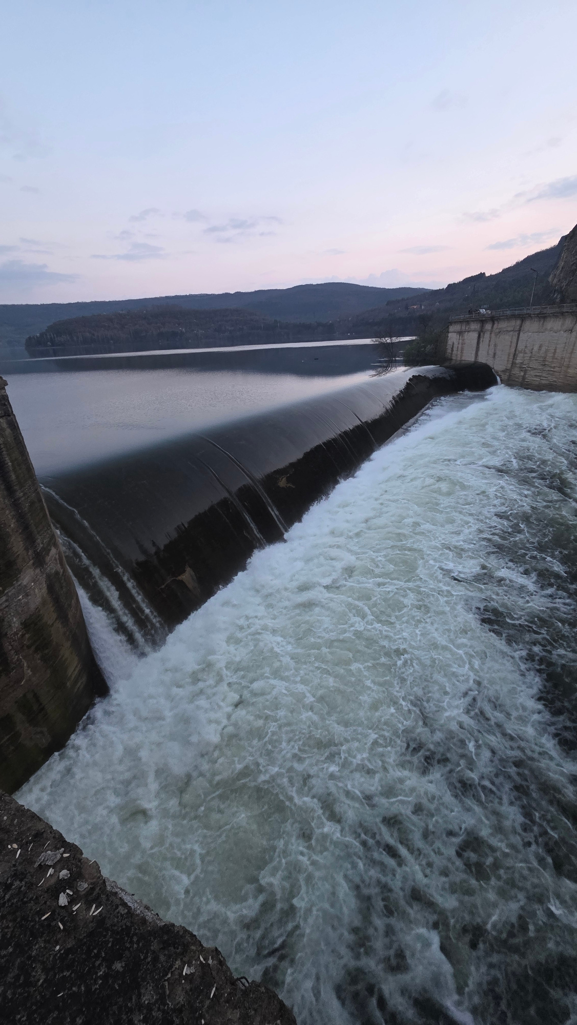 A wide-angle shot depicts a dam in Gorsko Kosovo, Bulgaria. Water spills over the dam's edge, creating a turbulent, frothy flow. The sky is a pale gradient, transitioning from light pink near the hori…read more
