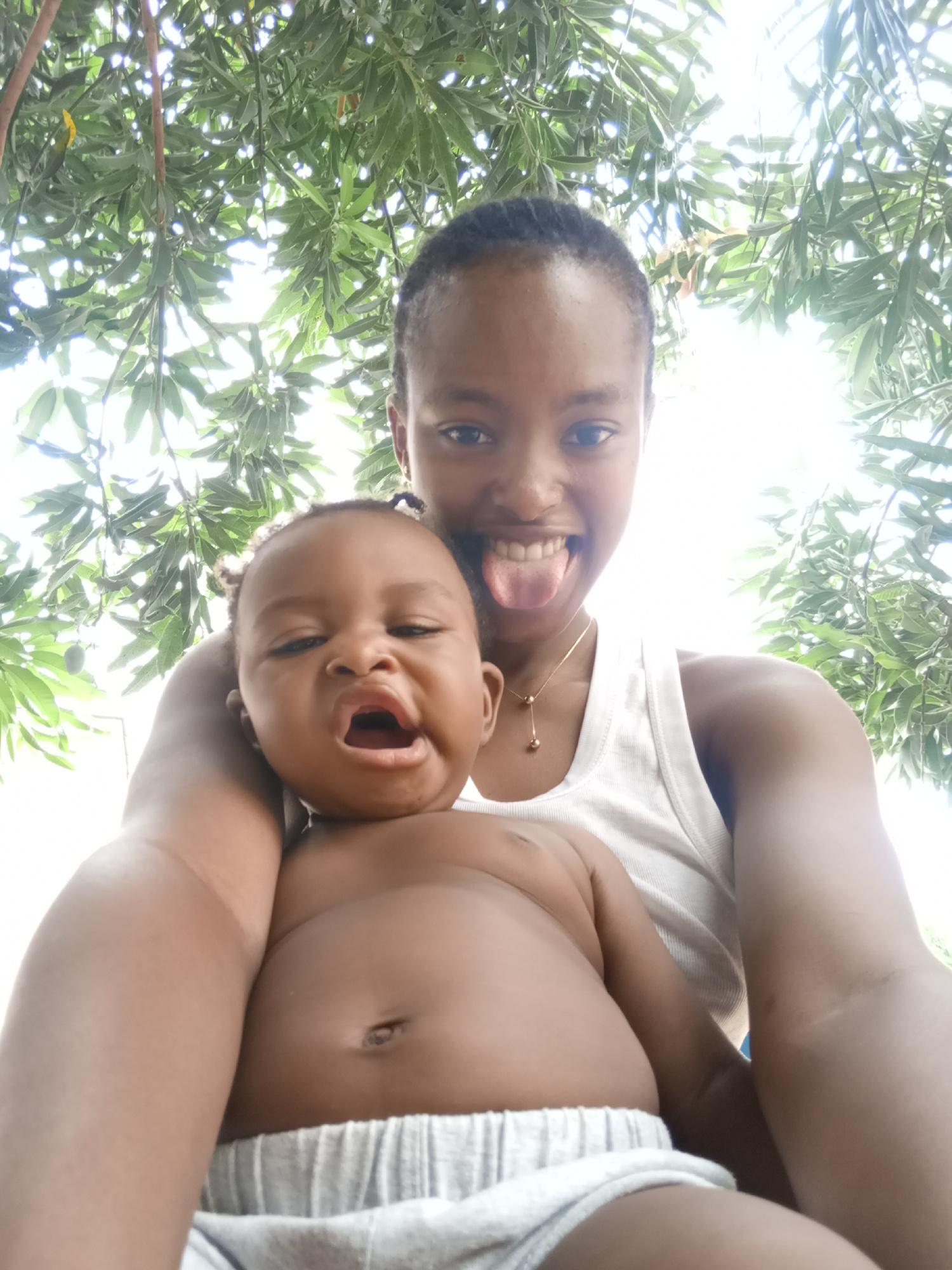 A selfie shows a young adult and a baby in an outdoor setting, likely in daylight. The young adult, wearing a white tank top and a gold necklace, is holding the baby. She has dark hair and is sticking…read more