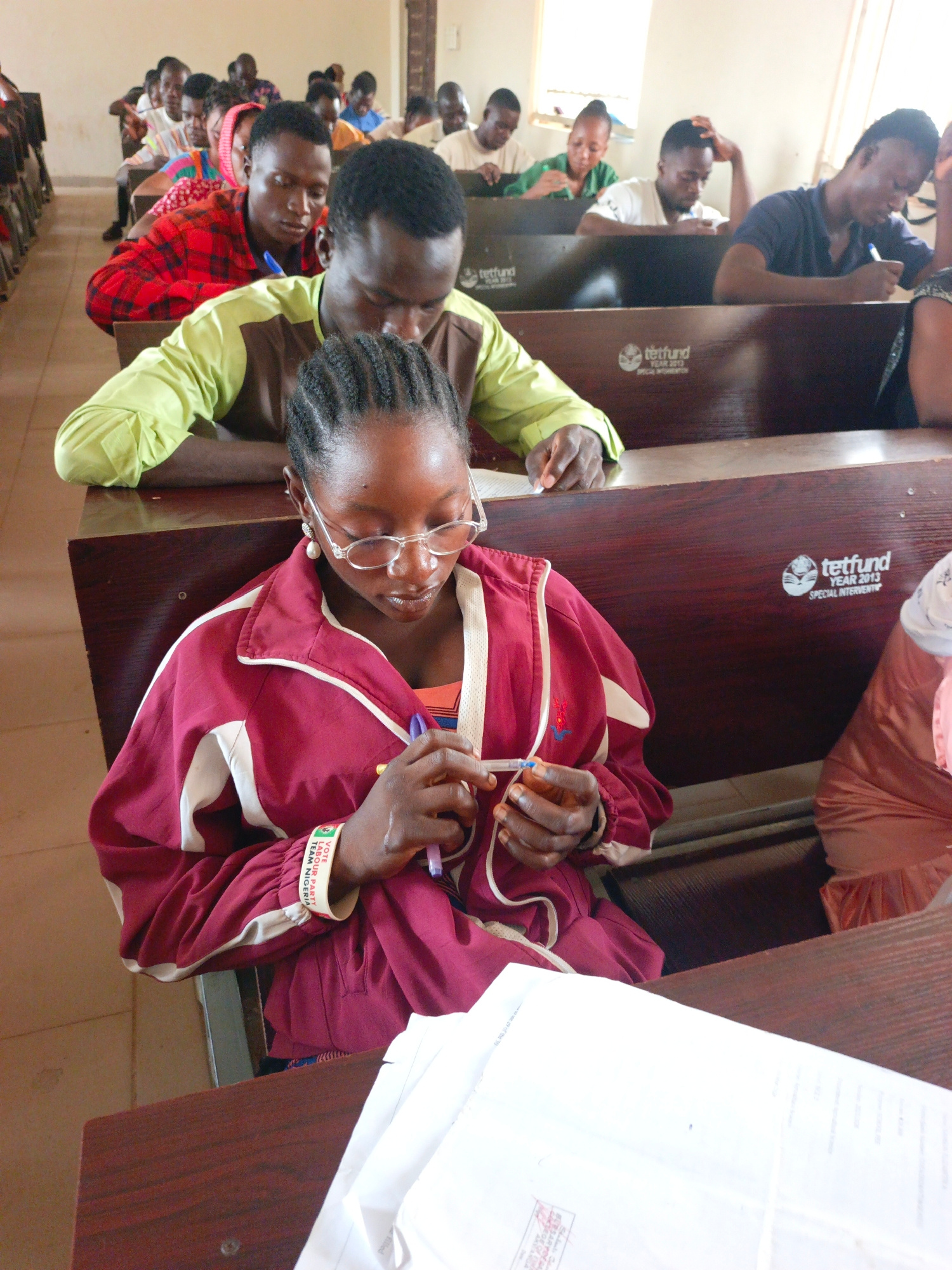In a classroom setting in Akwanga, Nigeria, a group of students are seated at wooden desks, seemingly engaged in a task, possibly an exam or assignment. The focus of the image is a young woman in the…read more