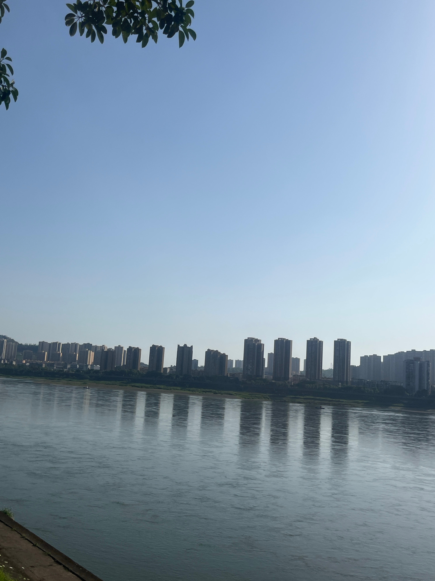 The image, taken in Jiangjin, China, presents a wide panoramic view of an urban river scene on a clear day. The frame is horizontally divided into two main sections: a vast, clear sky on the left and…read more