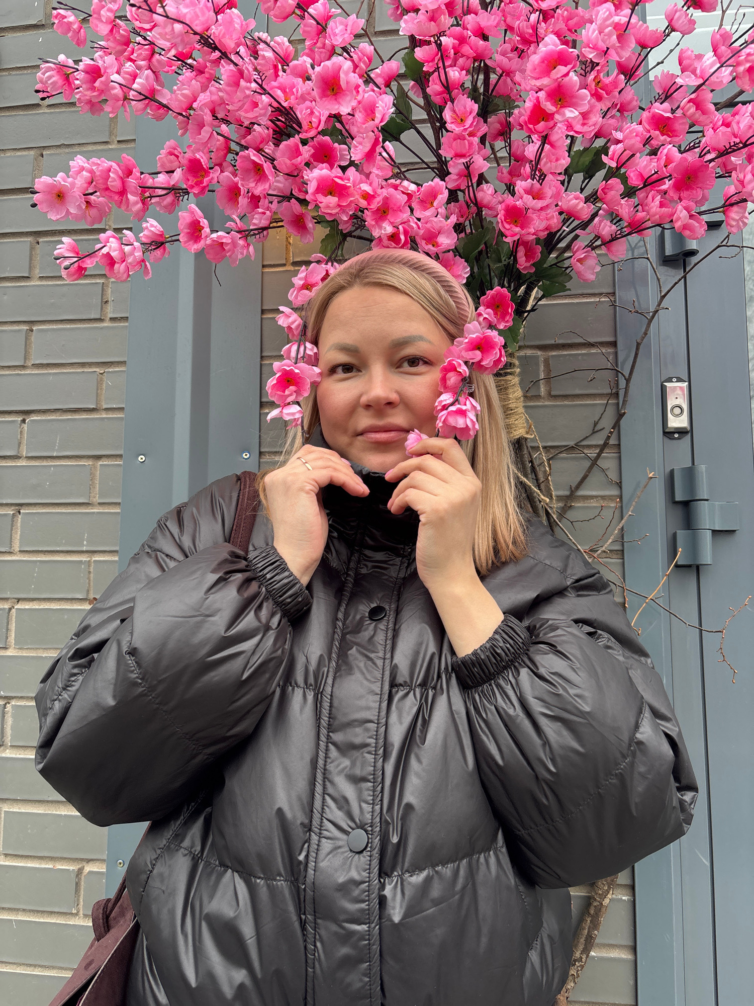 The image shows a woman in a black puffer jacket lying next to a wall decorated with pink artificial cherry blossoms. The wall appears to be made of grey bricks and is located outside. The woman is we…read more