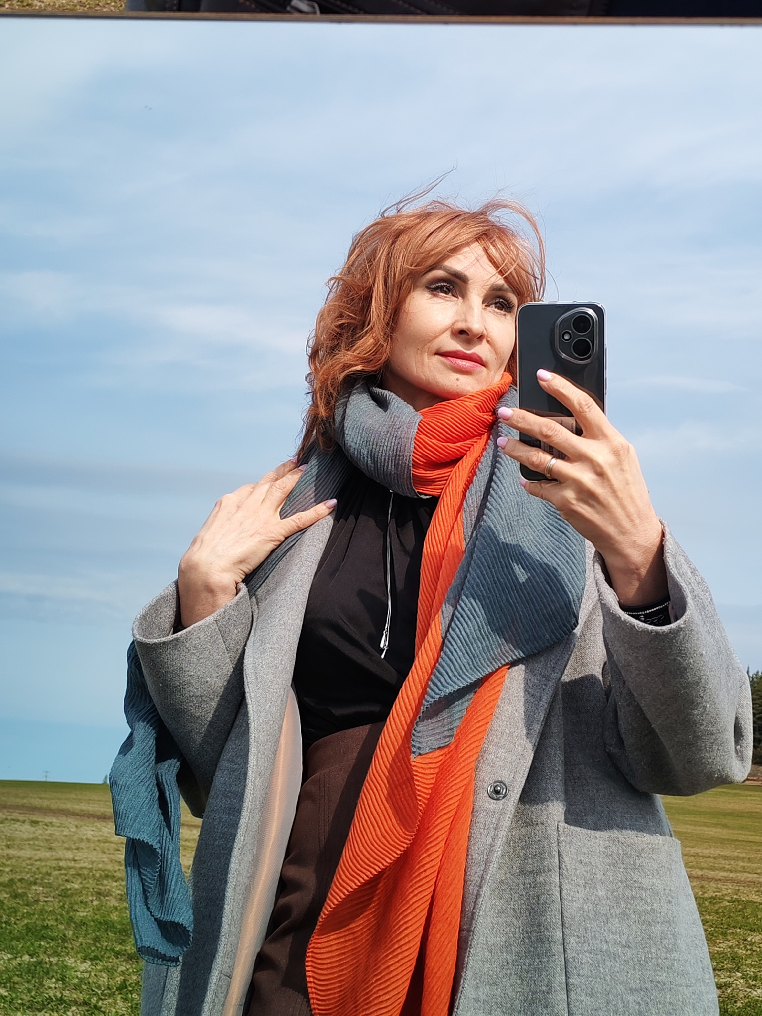 A woman with reddish-brown hair is holding a black smartphone, presumably taking a selfie outdoors. She is wearing a gray coat and a black shirt underneath, with an orange and blue pleated scarf wrapp…read more