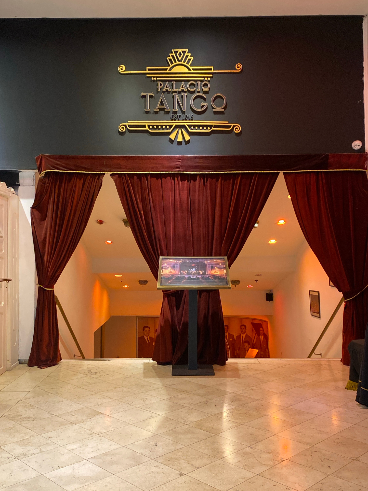 The image depicts the entrance to Palacio Tango in Buenos Aires, Argentina. A black wall on the left displays a golden art deco-style logo. A dark red curtain frames an entranceway, revealing an illum…read more