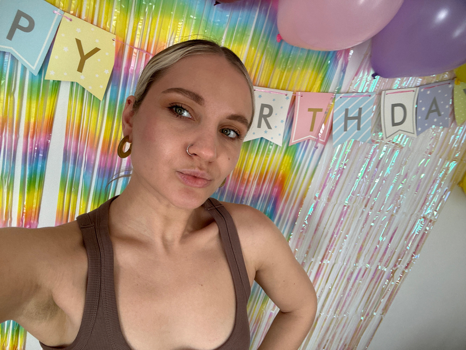 A person, likely female, is seen upside down in a selfie-style photograph. She is wearing a brown tank top. Her face is partially visible, showing her eyes, nose with a ring, and lips. She has short b…read more