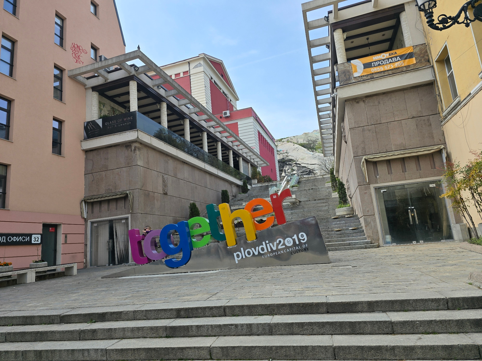 The image shows a cityscape, likely in Europe, featuring an art installation in the foreground. The installation spells out "together" in large, colorful letters, placed on a grey base with the inscri…read more