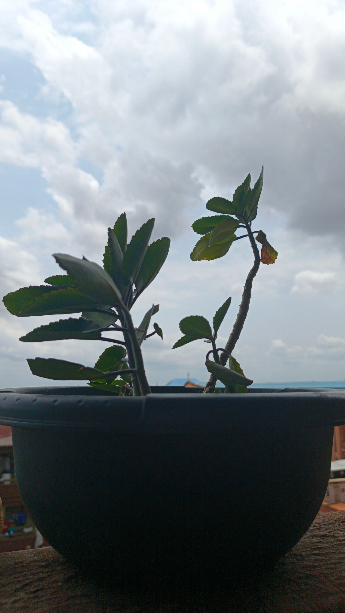 A potted plant with two shoots sits on a wooden surface, likely a balcony or windowsill. The leaves are green with some showing signs of yellowing or drying. The plant pot is large and black. The back…read more