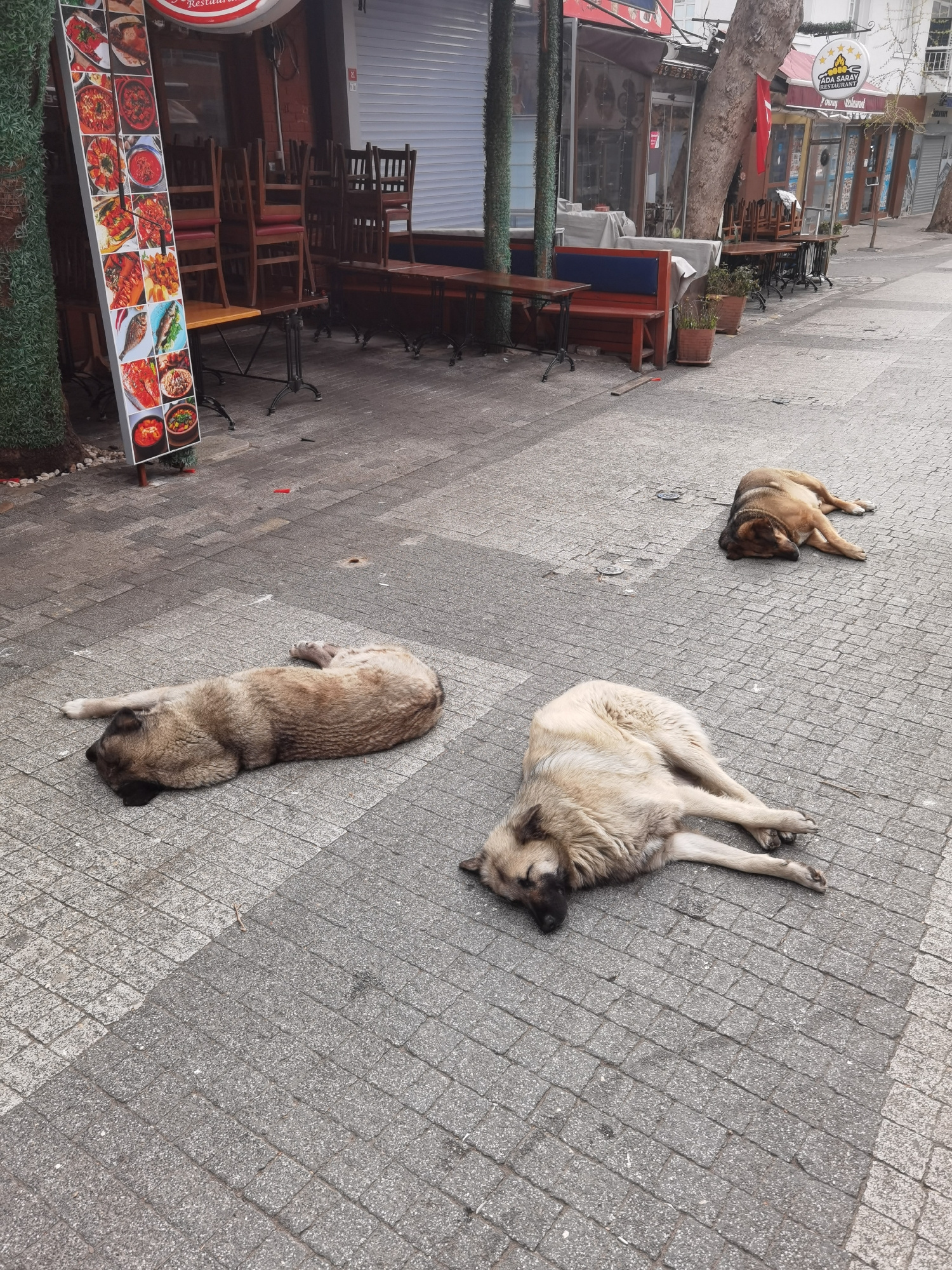 Three dogs are sleeping on a gray, brick-paved sidewalk. In the background are closed restaurants with outdoor seating consisting of tables and chairs. A menu board displaying food images stands nextβ¦read more
