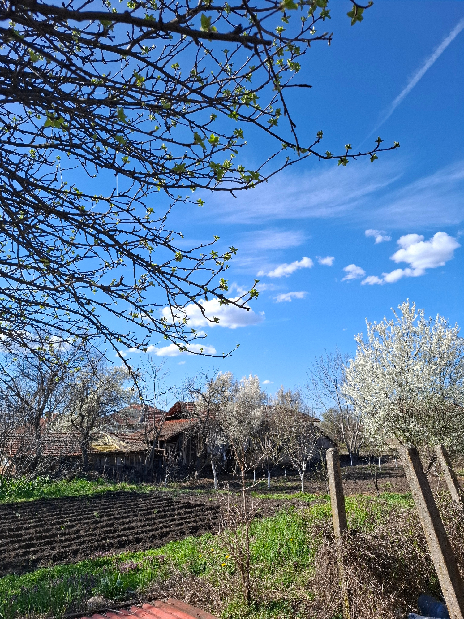 The image captures a rural scene in Gramada, Bulgaria, under a clear blue sky dotted with scattered white clouds. In the foreground, a tree with budding green leaves partially obscures the view, contr…read more