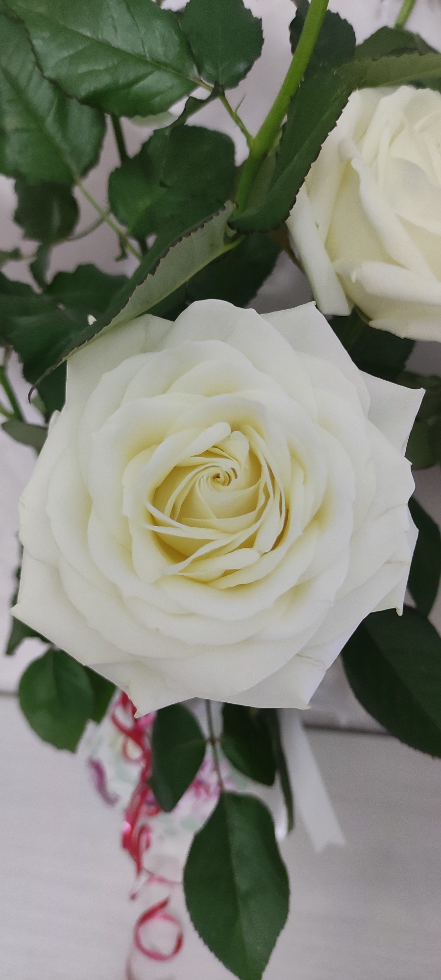 The image shows a close-up of a white rose in full bloom. The petals are tightly arranged in the center, gradually opening outwards. There are green leaves and part of another white rose in the backgr…read more
