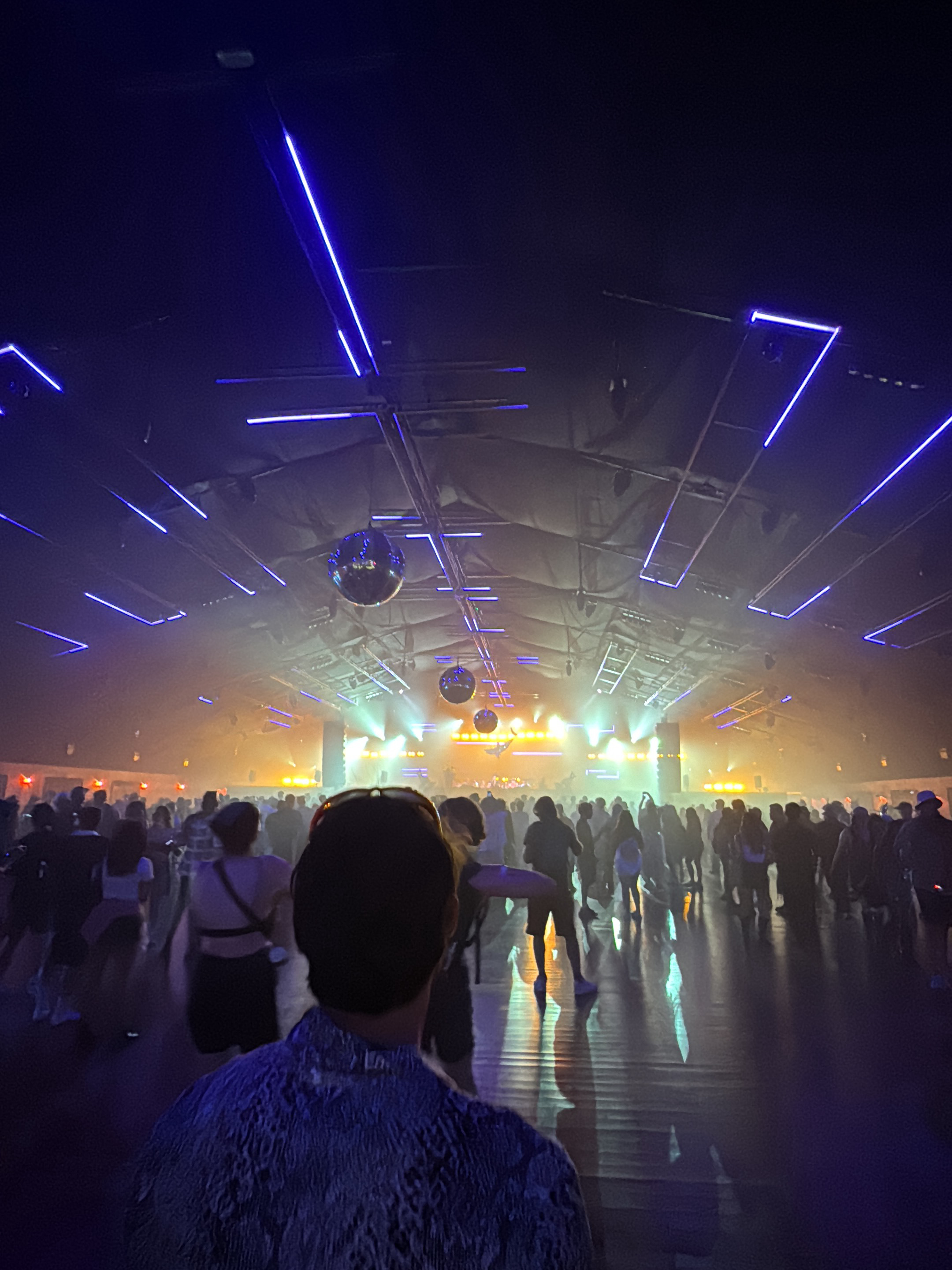 The image depicts a large indoor venue with a crowd of people, likely a concert or dance club, located in Indio, United States. The foreground shows the back of a person wearing a patterned shirt, whi…read more