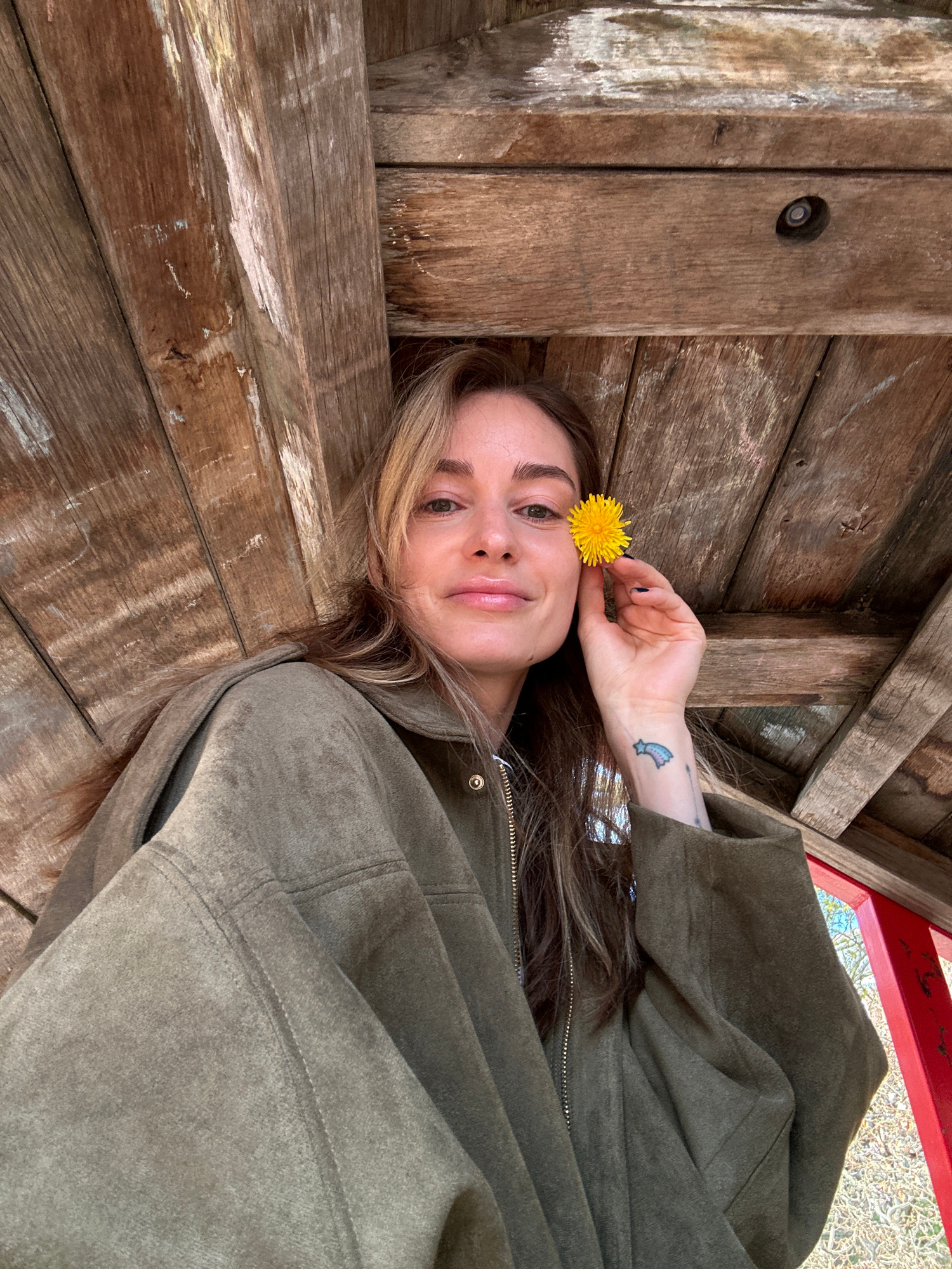 This image captures a young woman lying on or against a weathered wooden surface, set outdoors in Kiel, Germany. She has long, light brown hair with blonde highlights, and she looks directly at the camera with a gentle, serene smile. Her left hand is raised, delicately holding a bright yellow dandelion flower against her temple. On her left wrist, a distinctive tattoo of a blue and white shooting star, trailing small dots, is visible. She is dressed in a dark olive-green jacket, possibly made of a soft, suede-like material, with visible seams, a zipper, and a brass-colored snap button. The jacket's texture and folds are prominent. The background is dominated by rustic, aged wooden planks, suggesting a natural and possibly coastal or park setting, typical of outdoor structures. A circular metal fitting is embedded in one of the wooden beams on the left. In the upper right corner, a glimpse of a red-painted wooden beam adds a contrasting color element to the natural tones. The lighting indicates it is daytime, with bright ambient light. The scene conveys a calm and natural atmosphere. No text is visible in the image. | Open Wire