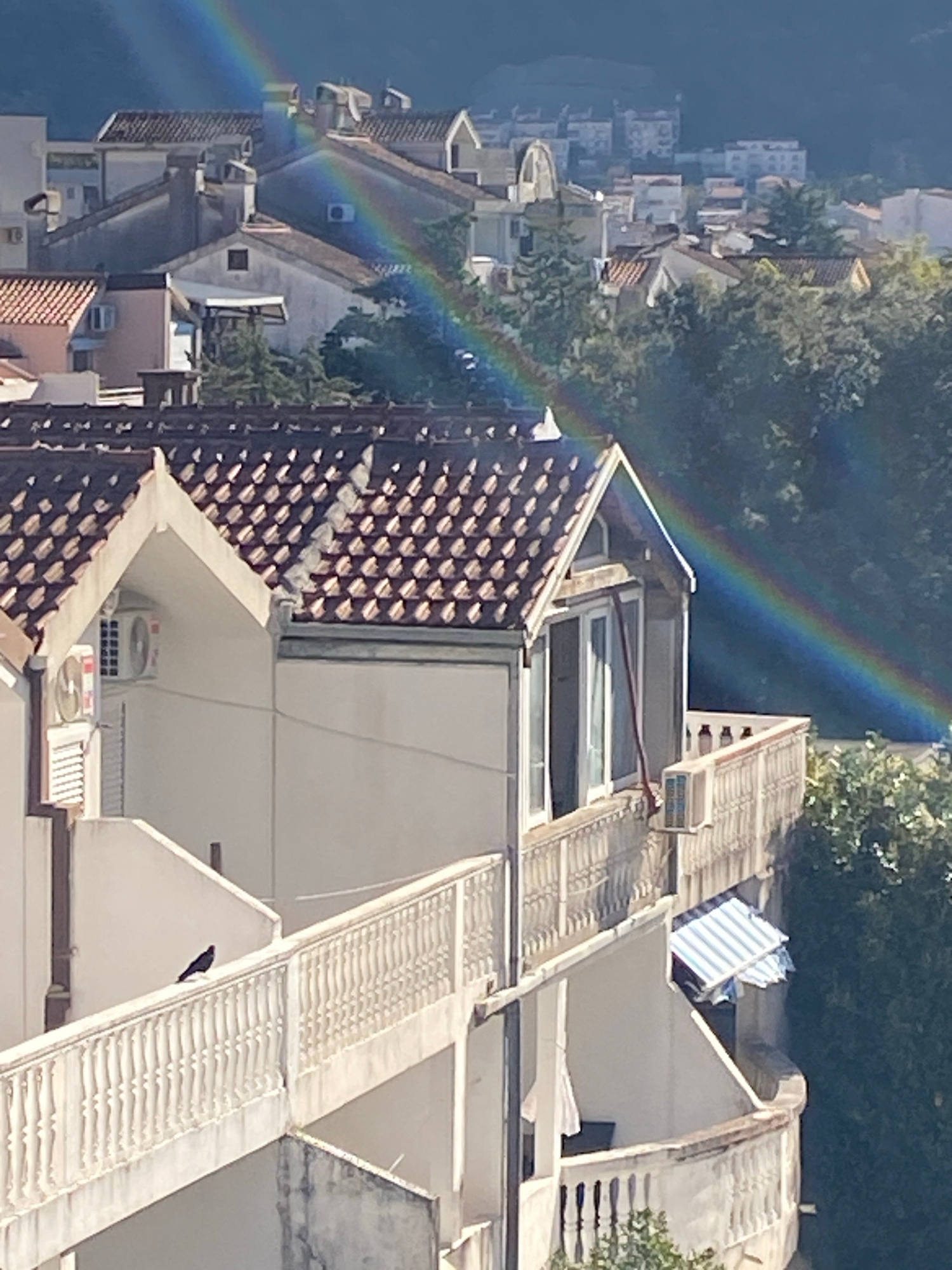 The image depicts an aerial view of a section of Budva, Montenegro, characterized by densely packed buildings with a mix of white-walled structures and tiled roofs. In the foreground are several multi…read more