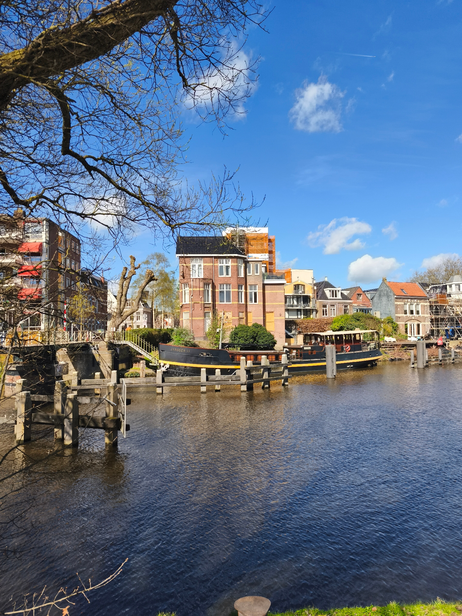 The image captures a view of a canal in Groningen, Netherlands, with a large black and yellow boat moored alongside. The boat has "Janssen 55" printed on its side. A pedestrian bridge crosses the cana…read more